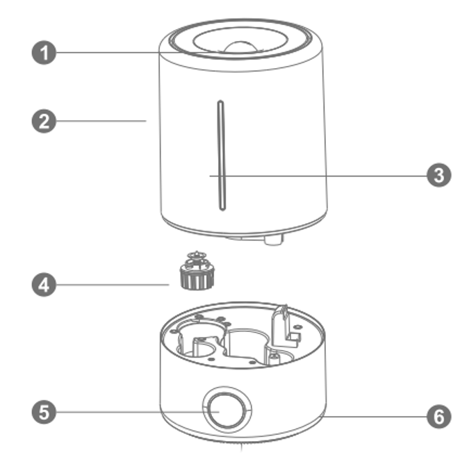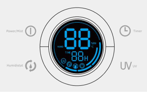 1. Nút “Power/Mist ”: Chạm 1 lần, máy kêu “Bip” và hoạt động mặc định ở mức thấp. Chạm 2 lần máy hoạt động ở mức trung bình; chạm 3 lần máy hoạt động ở mức cao. Đèn sẽ báo sáng ở mỗi mức lựa chọn. Màn hình tự động hiển thị nhiệt độ và độ ẩm hiện tại luân phiên nhau sau khi bật máy. Muốn tắt máy ấn giữ nút này khoảng 3 giây.